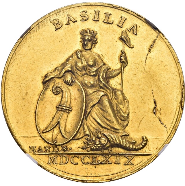 スイス・バーゼルより1769年に発行された5ダカット金貨です。 表面には、城壁の王冠をいただいたバーゼルの象徴の女神の座像が描かれています。その左手にはフリージア帽を持ち、右手は楕円形のバーゼルの盾に置かれ、足元には大地の恵みの象徴と彫刻家HANDM(ヨハン・ヤコブ・I・ハンドマン)の署名があり、さらには、ローマ数字の年号が描かれています。 裏面には、神の輝く目の下に、手のひらと月桂樹の枝が置かれた立方体の祭壇が描かれています。 これぞスイスのアンティークコインというべき素晴らしいデザインの大型5ダカット金貨であり、しかも、鑑定数がわずか2枚しか存在しない、とても貴重な逸品です。 金貨の基本データ 【量目】 17.04g 【直径】 13.61mm