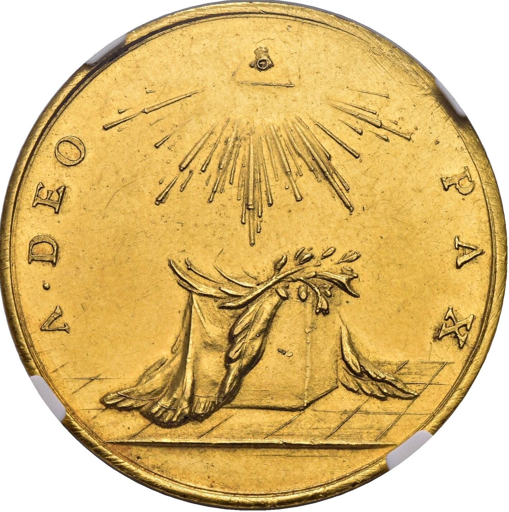 裏面には、神の輝く目の下に、手のひらと月桂樹の枝が置かれた立方体の祭壇が描かれています。