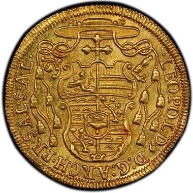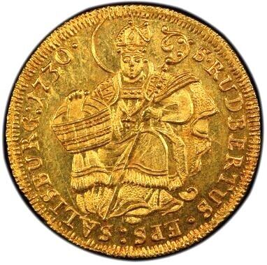 1730年にオーストリア・ザルツブルク司教国のレオポルド・アントン・フォン・フィルミアン伯爵・王子司教により発行されたダカット金貨です。
